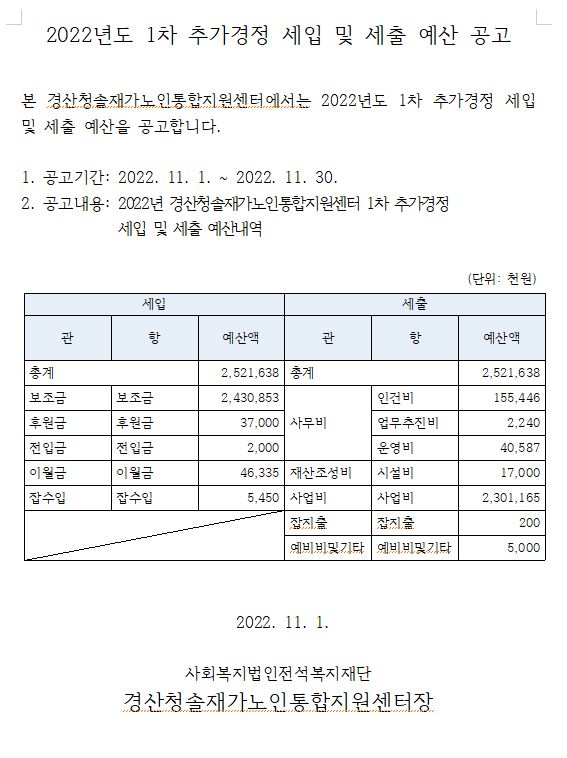 2022년도 1차 추가경정 세입 및 세출 예산 공고 페이지 정보 작성자 최고관리자 댓글 0건 조회 1,729회 작성일 22-11-01 14:16 본문 2022년도 1차 추가경정 세입 및 세출 예산 공고합니다. 목록 이전글2022년도 재가노인통합지원센터 종사자(조리원) 공개모집 22.11.09 다음글2022년도 재가노인통합지원센터 종사자(조리원) 공개모집 22.10.25 댓글목록 댓글목록 등록된 댓글이 없습니다.