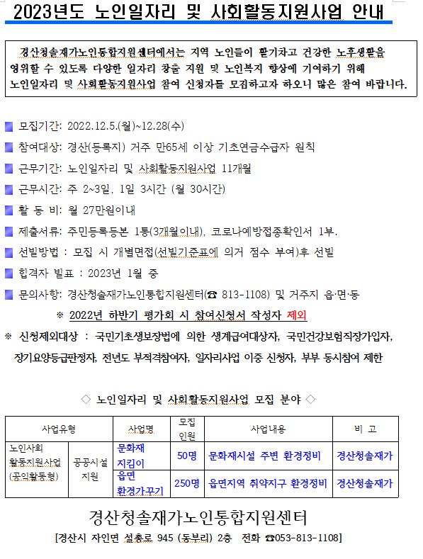 2023년도 노인일자리 및 사회활동지원사업 안내 페이지 정보 작성자 최고관리자 댓글 0건 조회 1,644회 작성일 22-12-06 11:17 본문 2023년 노인일자리 및 사회활동지원사업 참여자를 모집합니다. 목록 이전글2023년 노인맞춤돌봄서비스 종사자(전담사회복지사, 생활지원사) 채용 22.12.08 다음글2023년도 노인일자리 담당인력 공개모집 22.12.06 댓글목록 댓글목록 등록된 댓글이 없습니다.