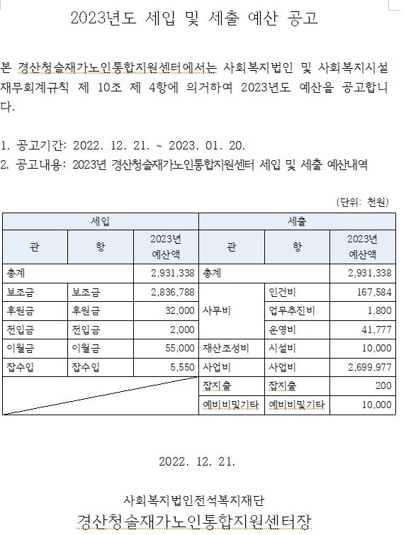 2023년도 세입 및 세출 예산 공고 페이지 정보 작성자 최고관리자 댓글 0건 조회 1,604회 작성일 22-12-21 14:31 본문 .. 목록 이전글2023년도 재가노인통합지원센터 종사자(사회복지사) 공개모집 22.12.28 다음글2023년 노인맞춤돌봄서비스 종사자(전담사회복지사, 생활지원사) 채용 22.12.08 댓글목록 댓글목록 등록된 댓글이 없습니다.
