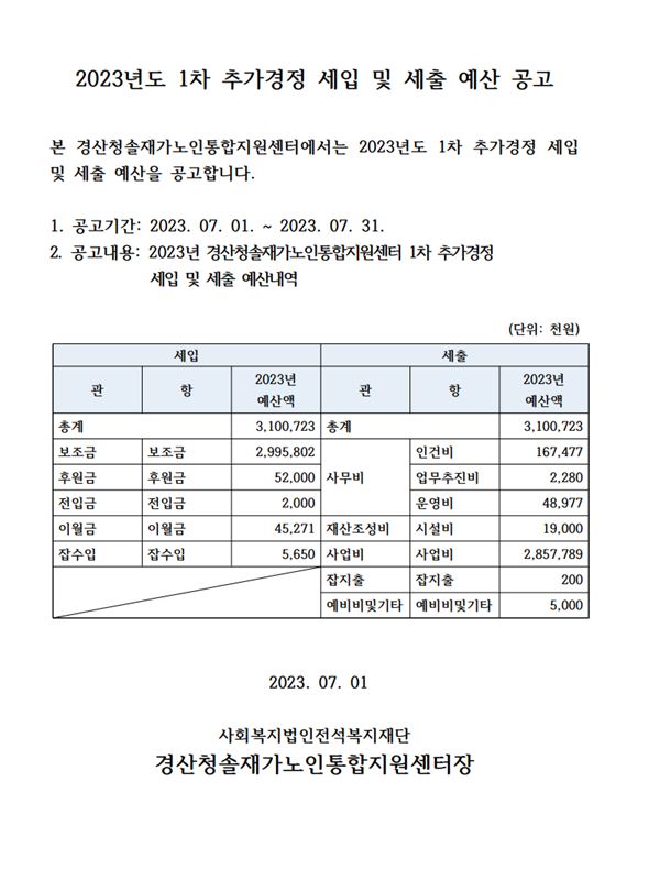 2023년 1차 추가경정 예산을 공고합니다.